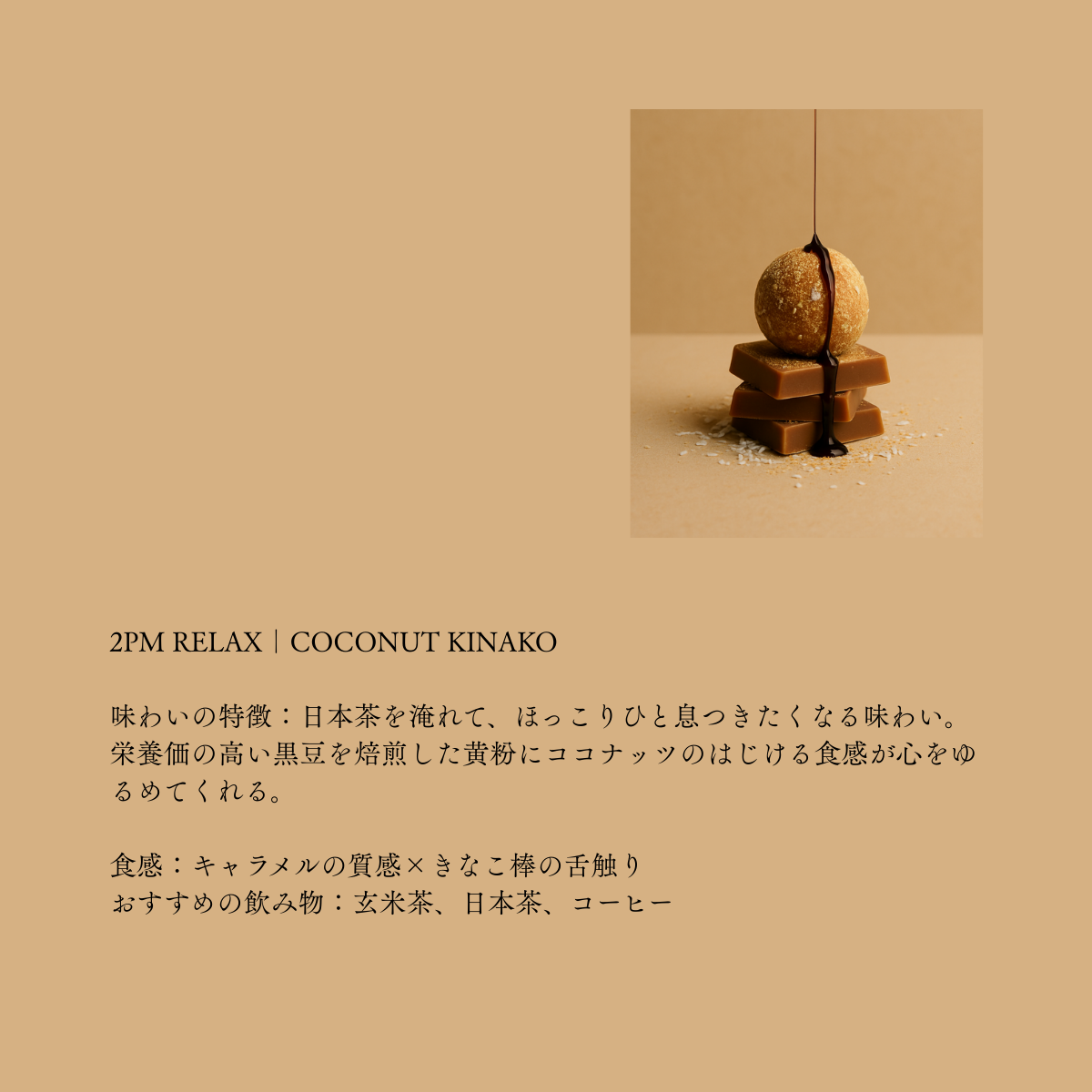 2PM RELAXは、無農薬・自然栽培のデーツを中心に、 玄米、黒豆、ココナッツ、雪塩 といった 古代から親しまれてきた素材の力を活かして設計されています。白砂糖・小麦・添加物は使用していません。