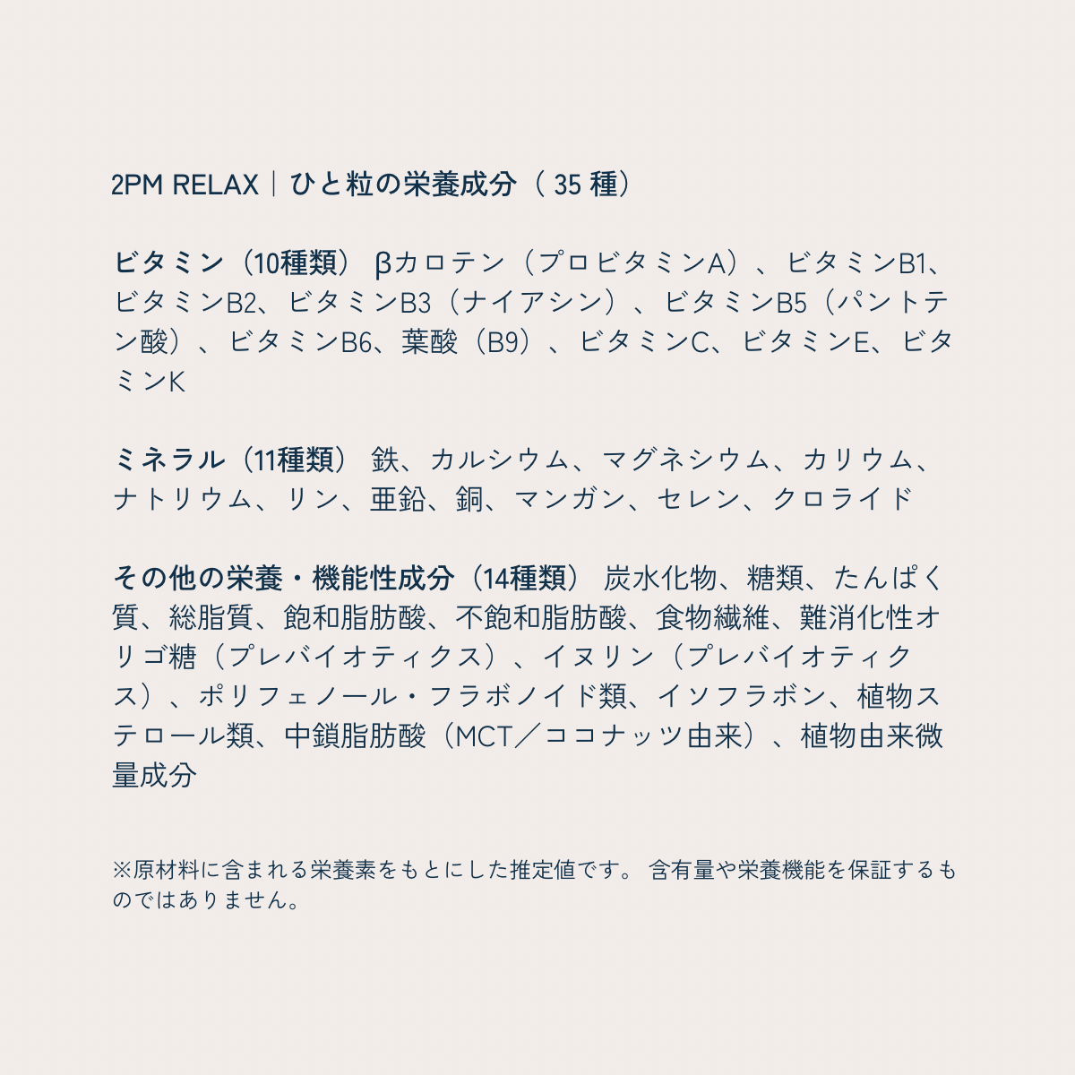 2PM RELAXは、最低でも35種類以上の栄養素・栄養源を含むと 推定されるフレーバーです。